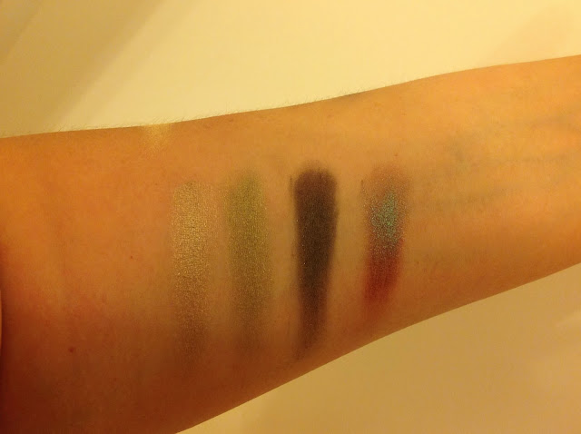 I was especially disappointed with the last shade – I was happy to have a really dark black shadow for the smoky eye, but it was a massive fail as you can see from the swatch. Also not really worth mentioning is the light shimmery color next to the black – it is almost identical to the first shade in the upper row.