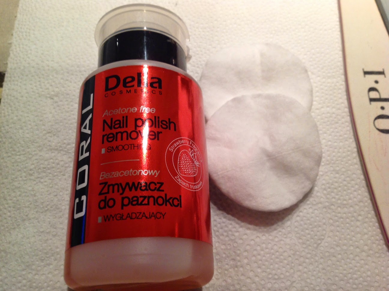 Next up, it’s time to get that old nail polish off. I just bought this Delia polish remover which smells like strawberries and doesn’t contain any acetone. I kind of prefer it this way, since I find that acetone really dries up my nails.