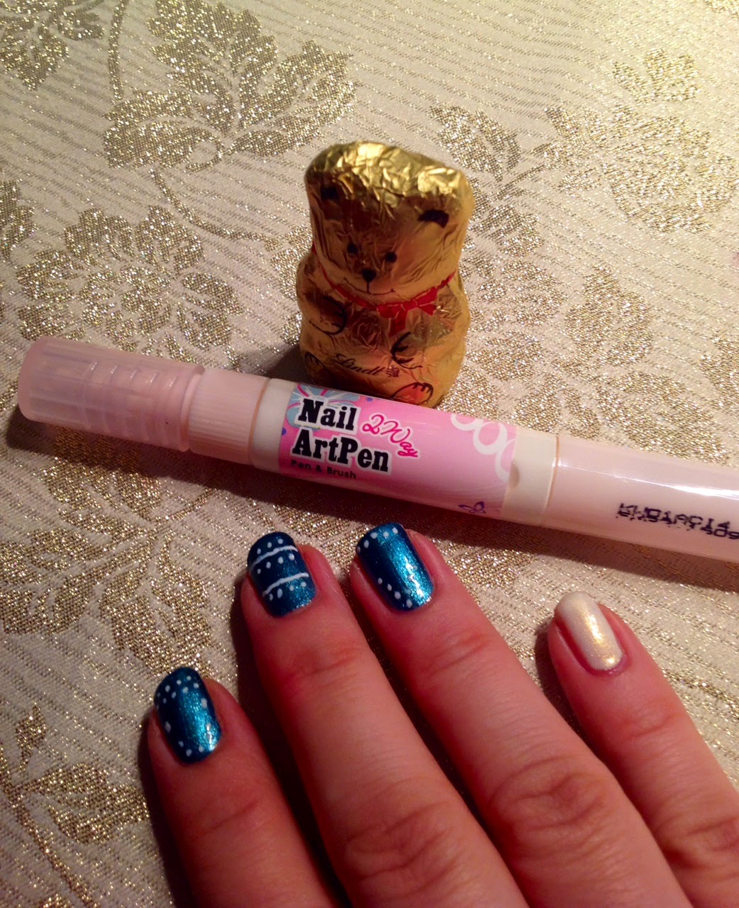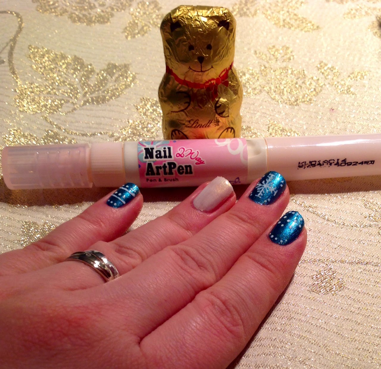 Next, I really got a lot of use from the nail art pen, doing different patterns on both hands. I even managed a relatively nice snowflake on one of the nails while this little chocolate dude was controlling my work.